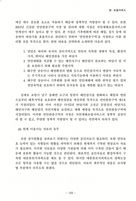 Ⅳ. 조절서비스 129 에선 매우 중요한 요소로 작용하기 때문에 정책적인 지향점이 될 수 있다. 또한 2013년 신설된 연안완충구역 지정 및 관리에 대한 지침은 자연재해조절서비스와 연계성이 매우 높다고 할 수 있다. 본 지침은 기후변화에 따른 해일, 침식 등에 대 응하여 바닷가를 효율적으로 관리하기 위하여 ‘연안완충구역’을 지정하고 이를 관 리할 것을 목적으로 한다. 관련 내용을 간략하게 소개하면 다음과 같다. 1. 연안은 바다와 육지의 전이지역으로 연안의 독특한 생태적 특징, 환경적 가치, 뛰어난 해안경관을 가진 바닷가 2. 연안재해를 저감할 수 있는 해안사구나 해안림이 분포하는 바닷가 및 이 를 보전하기 위해 필요한 주변지역 3. 해수면 상승이나 해양환경의 변화 등으로 연안침식이나 범람이 지속적 또 는 ...