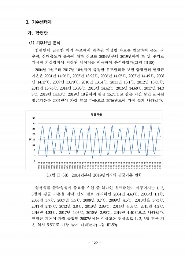 129 3. 기수생태계 가. 함평만 1 기후요인 분석 함평만에 근접한 지역 목포에서 관측된 기상청 자료를 참고하여 온도, 강 수량, 상대습도와 풍속에 대한 정보를 2004년부터 2019년까지 한 달 주기로 기상청 기상장치에 저장된 데이터를 이용하여 분석하였다 그림 III-58 2004년 1월부터 2017년 10월까지 측정한 온도변화를 보면 함평만의 연평균 기온은 2004년 14.96℃, 2005년 13.92℃, 2006년 14.05℃, 2007년 14.49℃, 2008 년 14.17℃, 2009년 13.79℃, 2010년 13.51℃, 2011년 13.1℃, 2012년 13.05℃, 2013년 13.76℃, 2014년 13.93℃, 2015년 14.42℃, 2016년 14.68℃, 2017년 14.3 3℃,...