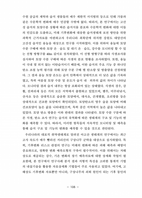 135 수원 공급의 제약과 습지 생물들의 매우 제한적 서식범위 등으로 인해 가뭄과 같은 수문학적 변화에 매우 민감할 수밖에 없다. 따라서, 본 연구에서는 고산 성 습지의 토양수분 상황에 따른 습지식물 분포와 수문학적 변화에 대한 이들 의 민감도를 도출하고, 미래 기후변화에 대응한 습지생태계 보전 방안을 위한 과학적 근거자료를 마련하고자 우리나라 최북단에 위치한 강원도 대암산의 고산성 습지인 용늪을 대상으로 연구를 시작하였다. 이를 위하여 용늪에 토양 수분 구배에 따라 토양 온?습도 및 대기 온?습도, 강수를 모니터링 할 수 있 는 선형 방형구를 40m 길이로 설치하였다. 이 선형 방형구를 따라 식생조사를 실시하여 토양 수분 구배에 따른 식생의 분포 현황을 조사하였다. 또한, 용늪 이 국내 몇 되지 않는 이탄...