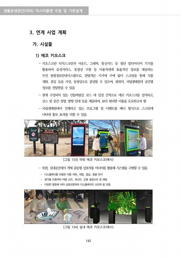 생물공생공간 야외 마스터플랜 수립 및 기본설계 142 3. 연계 사업 계획 가. 시설물 1 에코 키오스크 키오스크란 터치스크린과 사운드, 그래픽, 통신카드 등 첨단 멀티미디어 기기를 활용하여 음성서비스, 동영상 구현 등 이용자에게 효율적인 정보를 제공하는 무인 종합정보안내시스템으로, 관람객은 시기에 구애 없이 스크린을 통해 식물 개화, 결실 등을 사진, 동영상으로 감상할 수 있으며, 현위치, 국립생태원의 공간별 정보를 전달받을 수 있음 현재 구성되어 있는 산들바람길 코스 내 일정 간격으로 에코 키오스크를 설치하고, 코스 및 공간 설명, 방향 안내 등을 제공하여, 보다 편리한 이용을 도모하고자 함 국립생태원에서 진행하고 있는 프로그램 및 이벤트를 배너 형식으로 스크린에 나타내 홍보 효과를 더할 수 있음 [그림...