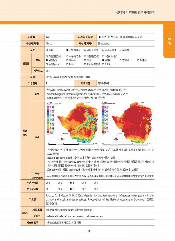 153 생태계 기후변화 연구사례분석 곤 충 사례 No. 126 사례 자료 유형 ■ 논문 □ 보고서 □ 기타 학술/기사자료 대상지 국가 Africa 대상지 지역 Zimbabwe 부문 □ 통합 ■ 취약성평가 □ 영향성평가 □ 리스크평가 □ 모델링 분류군 부문 □ 식물 활엽수 □ 식물 침엽수 □ 식물 활엽수 □ 식물 초 본 ■ 육상동물 □ 포유류 □ 조류 ■ 곤충 □ 양서류 □ 파충류 □ 수상동식물 □ 어류 □ 저서무척추류 □ 기타 세부정보 모기 목적 온도와 말라리아 매개모기의 발생위험도 예측 기후인자 T 자료기간 1950-2002 사례 개요 방법 아프리카 Zimbabwe의 다양한 지형에서 말라리아 전염의 기후 적합성을 평가함 United Kingdom Meteorological Office UKMO 의 기후변화...