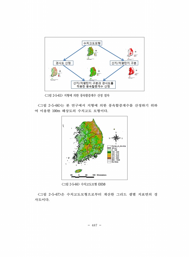 487 그림 2-5-65 지형에 의한 풍속할증계수 산정 절차 그림 2-5-66 는 본 연구에서 지형에 의한 풍속할증계수를 산정하기 위하 여 이용한 100m 해상도의 수치고도 모형이다. 그림 2-5-66 수치고도모형 DEM 그림 2-5-67 은 수치고도모형으로부터 계산한 그리드 셀별 지표면의 경사도이다.