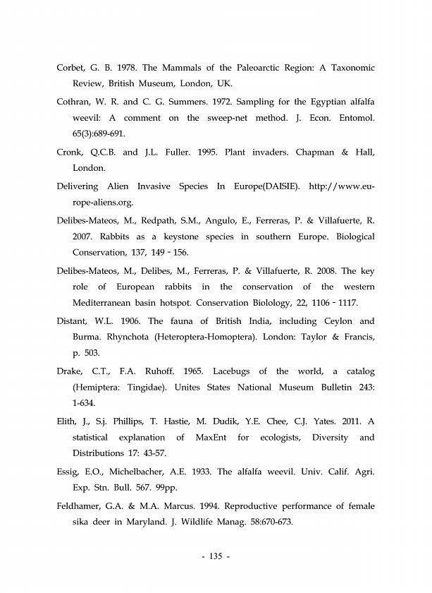 135 Corbet, G. B. 1978. The Mammals of the Paleoarctic RegionA Taxonomic Review, British Museum, London, UK. Cothran, W. R. and C. G. Summers. 1972. Sampling for the Egyptian alfalfa weevilA comment on the sweep-net method. J. Econ. Entomol. 65 3 689-691. Cronk, Q.C.B. and J.L. Fuller. 1995. Plant invaders. Chapman & Hall, London. Delivering Alien Invasive Species In Europe DAISIE http//www.europe...