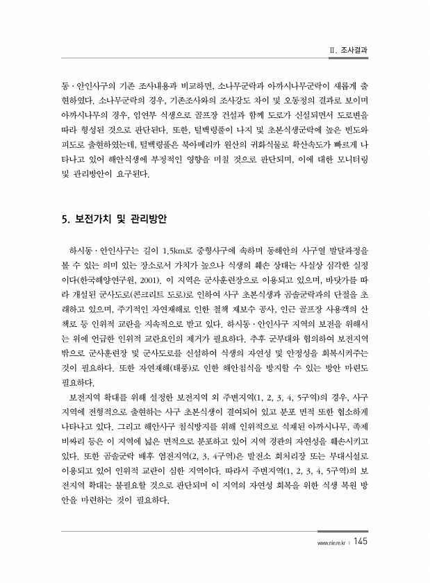 Ⅱ. 조사결과 www.nie.re.kr ? 145 동·안인사구의 기존 조사내용과 비교하면, 소나무군락과 아까시나무군락이 새롭게 출 현하였다. 소나무군락의 경우, 기존조사와의 조사강도 차이 및 오동정의 결과로 보이며 아까시나무의 경우, 임연부 식생으로 골프장 건설과 함께 도로가 신설되면서 도로변을 따라 형성된 것으로 판단된다. 또한, 털백령풀이 나지 및 초본식생군락에 높은 빈도와 피도로 출현하였는데, 털백령풀은 북아메리카 원산의 귀화식물로 확산속도가 빠르게 나 타나고 있어 해안식생에 부정적인 영향을 미칠 것으로 판단되며, 이에 대한 모니터링 및 관리방안이 요구된다. 5. 보전가치 및 관리방안 하시동·안인사구는 길이 1.5km로 중형사구에 속하며 동해안의 사구열 발달과정을 볼 수 있는 의미 있는 장소로서 가치가...