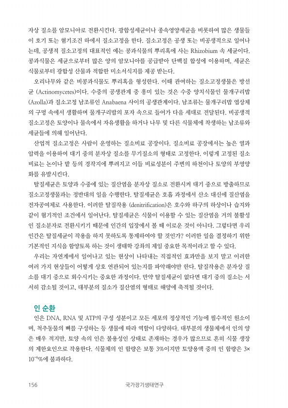 156 국가장기생태연구 자상 질소를 암모니아로 전환시킨다. 광합성세균이나 종속영양세균을 비롯하여 많은 생물들 이 호기 또는 혐기조건 하에서 질소고정을 한다. 질소고정은 공생 또는 비공생적으로 일어나 는데, 공생적 질소고정의 대표적인 예는 콩과식물의 뿌리혹에 사는 Rhizobium 속 세균이다. 콩과식물은 세균으로부터 많은 양의 암모니아를 공급받아 단백질 합성에 이용하며, 세균은 식물로부터 광합성 산물과 적합한 미소서식지를 제공 받는다. 오리나무와 같은 비콩과식물도 뿌리혹을 형성한다. 이때 관여하는 질소고정생물은 방선 균 Actinomycetes 이다. 수중의 공생관계 중 흥미 있는 것은 수중 양치식물인 물개구리밥 Azolla 과 질소고정 남조류인 Anabaena 사이의 공생관계이다. 남조류는 물개구리밥 엽상...