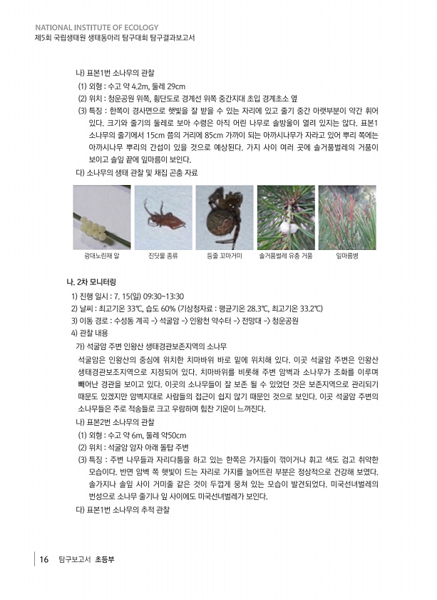16 탐구보고서 초등부 제5회 국립생태원 생태동아리 탐구대회 탐구결과보고서 나 표본1번 소나무의 관찰 1 외형 수고 약 4.2m, 둘레 29cm 2 위치 청운공원 위쪽, 횡단도로 경계선 위쪽 중간지대 초입 경계초소 옆 3 특징 한쪽이 경사면으로 햇빛을 잘 받을 수 있는 자리에 있고 줄기 중간 아랫부분이 약간 휘어 있다. 크기와 줄기의 둘레로 보아 수령은 아직 어린 나무로 솔방울이 열려 있지는 않다. 표본1 소나무의 줄기에서 15cm 쯤의 거리에 85cm 가까이 되는 아까시나무가 자라고 있어 뿌리 쪽에는 아까시나무 뿌리의 간섭이 있을 것으로 예상된다. 가지 사이 여러 곳에 솔거품벌레의 거품이 보이고 솔잎 끝에 잎마름이 보인다. 다 소나무의 생태 관찰 및 채집 곤충 자료 광대노린재 알 진딧물 종류 등줄 꼬마거미...