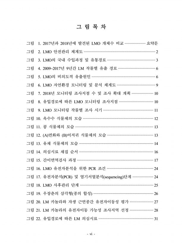vi 그 림 목 차 그림 1. 2017년과 2018년에 발견된 LMO 개체수 비교 ···················· 요약문 그림 2. LMO 안전관리 체계도 ······································································ 2 그림 3. LMO의 국내 수입과정 및 유통경로 ··············································· 3 그림 4. 20092017년 9년간 LM 작물별 유출 경로 ···································· 6 그림 5. LMO의 비의도적 유출원인 ······························································ 6 그림 ...
