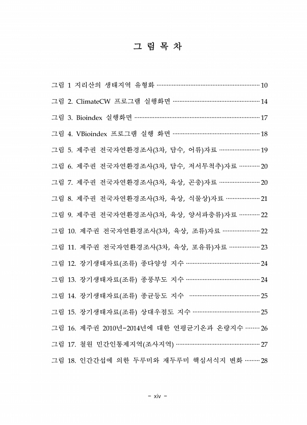 xiv 그 림 목 차 그림 지리산의 생태지역 유형화 그림 프로그램 실행화면 그림 실행화면 그림 프로그램 실행 화면 그림 제주권 전국자연환경조사 차 담수 어류 자료 그림 제주권 전국자연환경조사 차 담수 저서무척추 자료 그림 제주권 전국자연환경조사 차 육상 곤충 자료 그림 제주권 전국자연환경조사 차 육상 식물상 자료 그림 제주권 전국자연환경조사 차 육상 양서파충류 자료 그림 제주권 전국자연환경조사 차 육상 조류 자료 그림 제주권 전국자연환경조사 차 육상 포유류 자료 그림 장기생태자료 조류 종다양성 지수 그림 장기생태자료 조류 종풍부도 지수 그림 장기생태자료 조류 종균등도 지수 그림 장기생태자료 조류 상대우점도 지수 그림 제주권 년 년에 대한 연평균기온과 온량지수 그림 철원 민간인통제지역 조사지역 그림 인간간섭에...