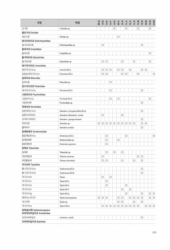155 모기류 Culicidae sp. ○ ○ ○ ○ 별모기과 Dixidae 애모기류 Dixidae sp. ○ 장다리파리과 Dolichopodidae 장다리파리류 Dolichopodidae sp. ○ ○ 춤파리과 Empididae 춤파리류 Empididae sp. ○ 물가파리과 Ephydridae 물가파리류 Ephydridae sp. ○ ○ ○ ○ ○ 애기각다귀과 Limoniidae 명주각다귀 KUa Antocha KUa ○ ○ ○ ○ ○ ○ ○ ○ 검정날개각다귀 KUa Hexatoma KUa ○ ○ ○ ○ ○ ○ 집파리과 Muscidae 집파리류 Muscidae sp. ○ 장수각다귀과 Pediciidae 애기각다귀 KUa Dicranota KUa ○ ○ 나방파리과 Psychodidae 나방파리 KUa Ps...