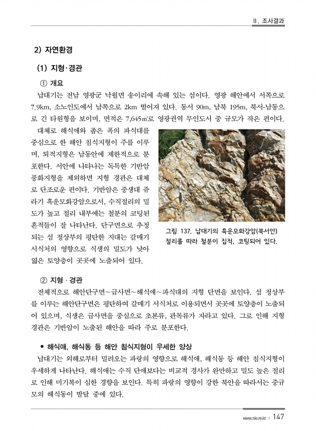 Ⅱ. 조사결과 www.nie.re.kr ? 147 그림 137. 납대기의 흑운모화강암 북서안 절리를 따라 철분이 집적, 코팅되어 있다. 2 자연환경 1 지형?경관 ① 개요 납대기는 전남 영광군 낙월면 송이리에 속해 있는 섬이다. 영광 해안에서 서쪽으로 7.9km, 소노인도에서 남쪽으로 2km 떨어져 있다. 동서 90m, 남북 195m, 북서-남동으 로 긴 타원형을 보이며, 면적은 7,645㎡로 영광권역 무인도서 중 규모가 작은 편이다. 대체로 해식애와 좁은 폭의 파식대를 중심으로 한 해안 침식지형이 주를 이루 며, 퇴적지형은 남동안에 제한적으로 분 포한다. 서안에 나타나는 독특한 기반암 풍화지형을 제외하면 지형 경관은 대체 로 단조로운 편이다. 기반암은 중생대 쥬 라기 흑운모화강암으로서, 수직절리의 밀 도가...