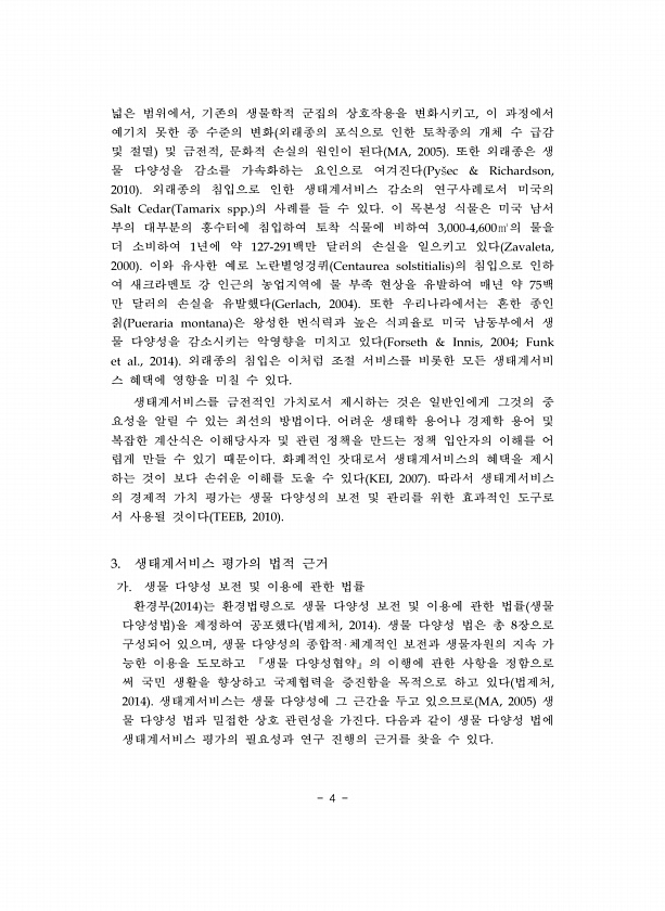 4 넓은 범위에서 기존의 생물학적 군집의 상호작용을 변화시키고 이 과정에서 예기치 못한 종 수준의 변화 외래종의 포식으로 인한 토착종의 개체 수 급감 및 절멸 및 금전적 문화적 손실의 원인이 된다 또한 외래종은 생 물 다양성을 감소를 가속화하는 요인으로 여겨진다 외래종의 침입으로 인한 생태계서비스 감소의 연구사례로서 미국의 의 사례를 들 수 있다 이 목본성 식물은 미국 남서 부의 대부분의 홍수터에 침입하여 토착 식물에 비하여 의 물을 더 소비하여 년에 약 백만 달러의 손실을 일으키고 있다 이와 유사한 예로 노란별엉겅퀴 의 침입으로 인하 여 새크라멘토 강 인근의 농업지역에 물 부족 현상을 유발하여 매년 약 백 만 달러의 손실을 유발했다 또한 우리나라에서는 흔한 종인 칡 은 왕성한 번식력과 높은 식피율로 미국 ...