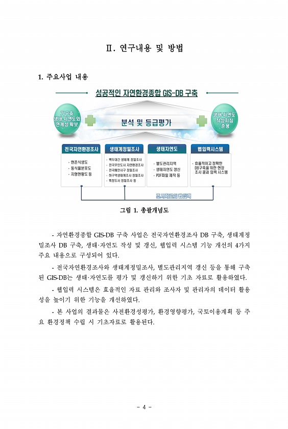 4 Ⅱ. 연구내용 및 방법 1. 주요사업 내용 그림 1. 총괄개념도 자연환경종합 GIS-DB 구축 사업은 전국자연환경조사 DB 구축, 생태계정 밀조사 DB 구축, 생태·자연도 작성 및 갱신, 웹입력 시스템 기능 개선의 4가지 주요 내용으로 구성되어 있다. 전국자연환경조사와 생태계정밀조사, 별도관리지역 갱신 등을 통해 구축 된 GIS-DB는 생태·자연도를 평가 및 갱신하기 위한 기초 자료로 활용하였다. 웹입력 시스템은 효율적인 자료 관리와 조사자 및 관리자의 데이터 활용 성을 높이기 위한 기능을 개선하였다. 본 사업의 결과물은 사전환경성평가, 환경영향평가, 국토이용계획 등 주 요 환경정책 수립 시 기초자료로활용된다.