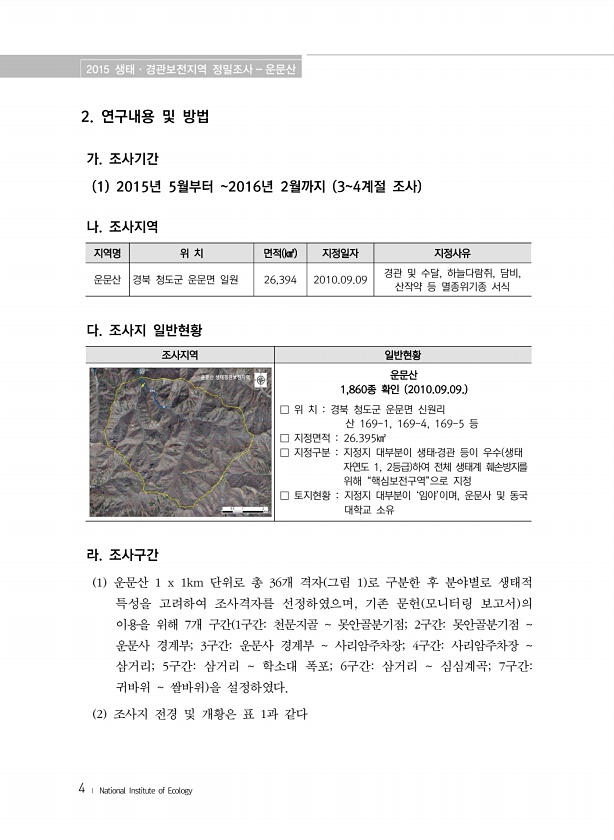 2015 생태·경관보전지역 정밀조사 운문산 4 ? National Institute of Ecology 2. 연구내용 및 방법 가. 조사기간 1 2015년 5월부터 2016년 2월까지 34계절 조사 나. 조사지역 지역명 위 치 면적 ㎢ 지정일자 지정사유 운문산 경북 청도군 운문면 일원 26,394 2010.09.09 경관 및 수달, 하늘다람쥐, 담비, 산작약 등 멸종위기종 서식 다. 조사지 일반현황 조사지역 일반현황 운문산 1,860종 확인 2010.09.09. □ 위 치 경북 청도군 운문면 신원리 산 169-1, 169-4, 169-5 등 □ 지정면적 26.395㎢ □ 지정구분 지정지 대부분이 생태?경관 등이 우수 생태 자연도 1, 2등급 하여 전체 생태계 훼손방지를 위해 “핵심보전구역”으로 지정 □ 토지...