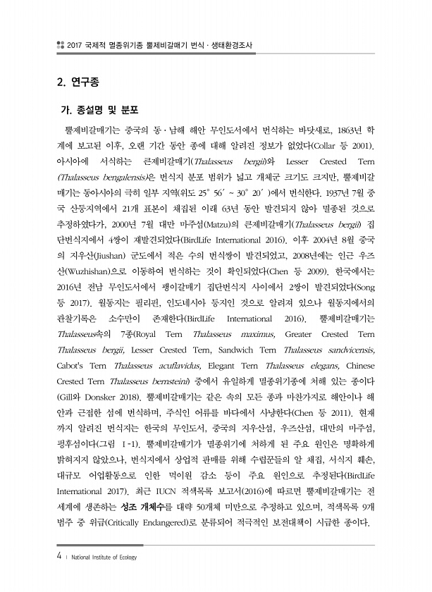 2017 국제적 멸종위기종 뿔제비갈매기 번식·생태환경조사 4 ? National Institute of Ecology 2. 연구종 가. 종설명 및 분포 뿔제비갈매기는 중국의 동·남해 해안 무인도서에서 번식하는 바닷새로, 1863년 학 계에 보고된 이후, 오랜 기간 동안 종에 대해 알려진 정보가 없었다 Collar 등 2001 아시아에 서식하는 큰제비갈매기 Thalasseus bergii 와 Lesser Crested Tern Thalasseus bengalensis 은 번식지 분포 범위가 넓고 개체군 크기도 크지만, 뿔제비갈 매기는 동아시아의 극히 일부 지역 위도 25°56′30°20′ 에서 번식한다. 1937년 7월 중 국 산둥지역에서 21개 표본이 채집된 이래 63년 동안 발견되지 않아 멸종된 것으로 추...