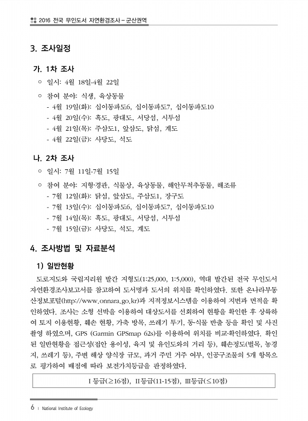 2016 전국 무인도서 자연환경조사 군산권역 6 ? National Institute of Ecology 3. 조사일정 가. 1차 조사 ? 일시4월 18일-4월 22일 ? 참여 분야식생, 육상동물 4월 19일 화 십이동파도6, 십이동파도7, 십이동파도10 4월 20일 수 흑도, 광대도, 서당섬, 시투섬 4월 21일 목 주삼도1, 앞삼도, 닭섬, 계도 4월 22일 금 사당도, 석도 나. 2차 조사 ? 일시7월 11일-7월 15일 ? 참여 분야지형?경관, 식물상, 육상동물, 해안무척추동물, 해조류 7월 12일 화 닭섬, 앞삼도, 주삼도1, 장구도 7월 13일 수 십이동파도6, 십이동파도7, 십이동파도10 7월 14일 목 흑도, 광대도, 서당섬, 시투섬 7월 15일 금 사당도, 석도, 계도 4. 조사방법 및 자료...