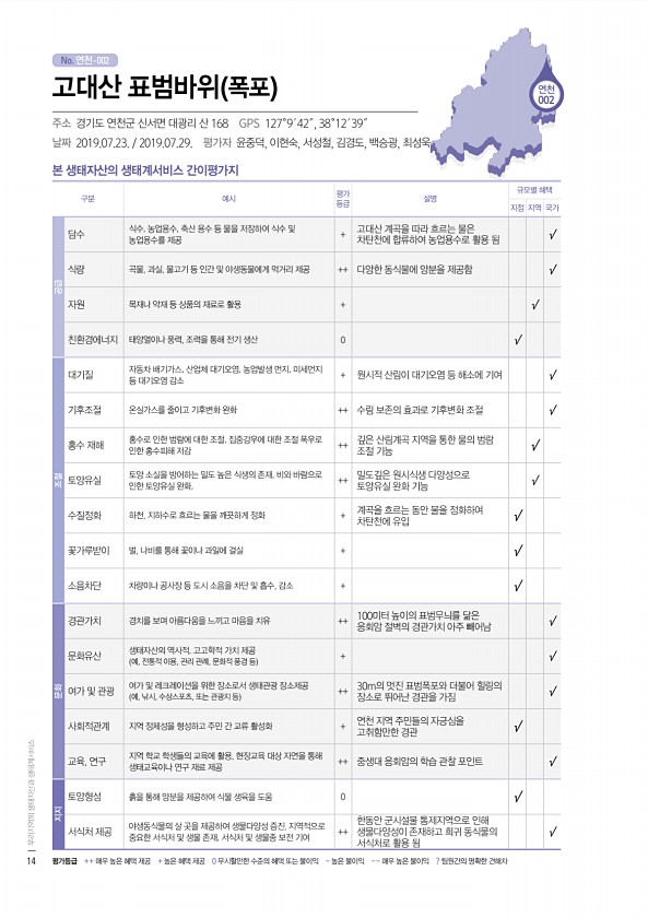 No. 연천- 연천 002 본 생태자산의 생태계서비스 간이평가지 구분 예시 평가 등급 설명 규모별 혜택 지점 지역 국가 공급 담수 식수, 농업용수, 축산 용수 등 물을 저장하여 식수 및 농업용수를 제공 + 고대산 계곡을 따라 흐르는 물은 차탄천에 합류하여 농업용수로 활용 됨 √ 식량 곡물, 과실, 물고기 등 인간 및 야생동물에게 먹거리 제공 ++ 다양한 동식물에 양분을 제공함 √ 자원 목재나 약재 등 상품의 재료로 활용 + √ 친환경에너지 태양열이나 풍력, 조력을 통해 전기 생산 0 √ 조절 대기질 자동차 배기가스, 산업체 대기오염, 농업발생 먼지, 미세먼지 등 대기오염 감소 + 원시적 산림이 대기오염 등 해소에 기여 √ 기후조절 온실가스를 줄이고 기후변화 완화 ++ 수림 보존의 효과로 기후변화 조절 √ 홍...