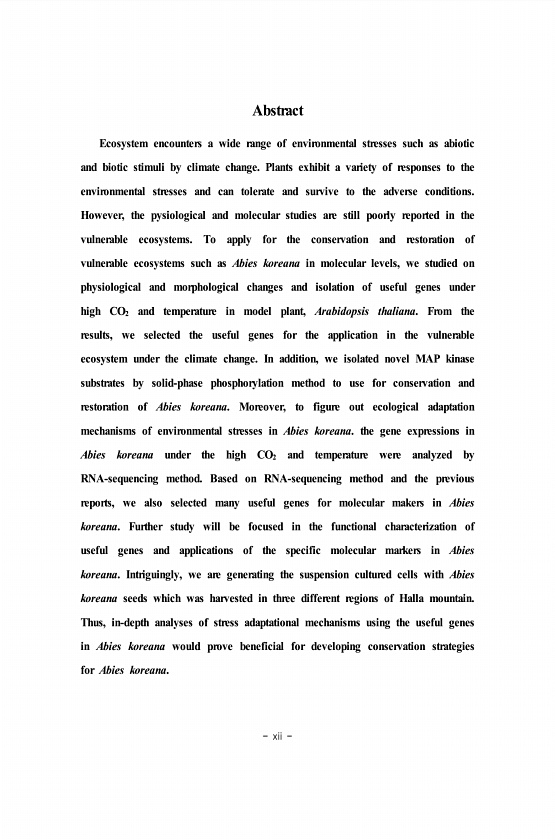 xii Abstract Ecosystem encounters a wide range of environmental stresses such as abiotic and biotic stimuli by climate change. Plants exhibit a variety of responses to the environmental stresses and can tolerate and survive to the adverse conditions. However, the pysiological and molecular studies are still poorly reported in the vulnerable ecosystems. To apply for the conservation and restoration...