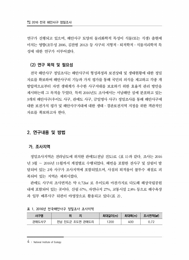 2016 전국 해안사구 정밀조사 4 ? National Institute of Ecology 연구가 진행되고 있으며, 해안사구 토양의 물리화학적 특성이 식물 또는 식생 출현에 미치는 영향 조두성 2006, 김찬범 2012 등 사구의 지형적·퇴적학적·식물지리학적 특 성에 대한 연구가 이루어졌다. 2 연구 목적 및 필요성 전국 해안사구 정밀조사는 해안사구의 형성과정과 보전상태 및 생태현황에 대한 정밀 자료를 확보하여 해안사구의 기능과 가치 평가를 통해 국민의 의식을 제고하고 각종 개 발압력으로부터 자연 생태계가 우수한 사구지대를 보호하기 위한 효율적 관리 방안을 제시하는데 그 목적을 두었다. 특히 2016년도 조사에서는 서남해안 섬에 분포하고 있는 3개의 해안사구 우이도 사구, 관매도 사구, 금일명사 사구 정밀...