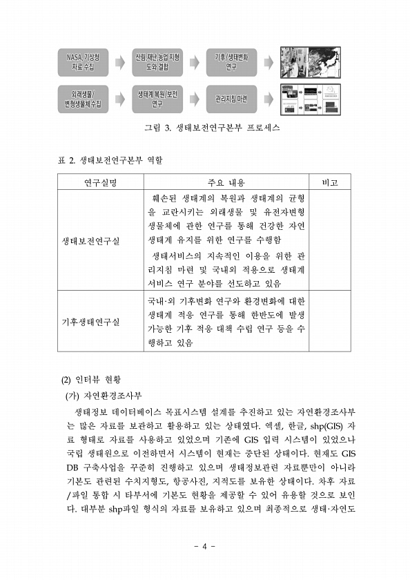 그림 3. 생태보전연구본부 프로세스 표 2. 생태보전연구본부 역할 연구실명 주요 내용 비고 생태보전연구실 훼손된 생태계의 복원과 생태계의 균형 을 교란시키는 외래생물 및 유전자변형 생물체에 관한 연구를 통해 건강한 자연 생태계 유지를 위한 연구를 수행함 생태서비스의 지속적인 이용을 위한 관 리지침 마련 및 국내외 적용으로 생태계 서비스 연구 분야를 선도하고 있음 기후생태연구실 국내·외 기후변화 연구와 환경변화에 대한 생태계 적응 연구를 통해 한반도에 발생 가능한 기후 적응 대책 수립 연구 등을 수 행하고 있음 2 인터뷰 현황 가 자연환경조사부 생태정보 데이터베이스 목표시스템 설계를 추진하고 있는 자연환경조사부 는 많은 자료를 보관하고 활용하고 있는 상태였다. 엑셀, 한글, shp GIS 자 료 형태로 자료를...