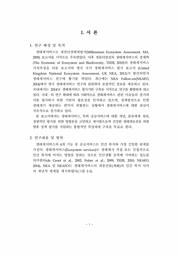 1 I. 서 론 1. 연구 배경 및 목적 생태계서비스는 새천년생태계평가 Millennium Ecosystem Assessment, MA, 2005 보고서를 시작으로 주목받았다. 이후 생물다양성과 생태계서비스의 경제학 The Economic of Ecosystem and Biodiversity, TEEB, 2010 의 생태계서비스 가치추정을 다룬 보고서와 영국 국가 생태계서비스 평가 보고서 United Kingdom National Ecosystem Assessment, UK NEA, 2011 가 발간되면서 생태계서비스 연구에 활기를 띄었다. 최근에는 NEA Follow-on NEAFO, 2014 에서 영국 생태계서비스 연구와 관련하여 포괄적인 정보를 제공하고 있다. 국내에서는 2014년 생태계서비스 평가기반...