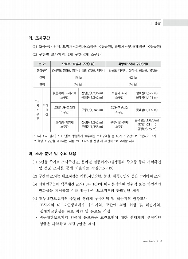 Ⅰ. 총괄 www.nie.re.kr ? 5 라. 조사구간 1 조사구간 위치묘적재∼화방재 소백산 국립공원 , 화방재∼댓재 태백산 국립공원 2 구간별 조사지역2개 구간 6개 소구간 분 야 묘적재∼화방재 구간 1팀 화방재∼댓재 구간 2팀 행정구역 경상북도 봉화군, 영주시, 강원 영월군, 태백시 강원도 태백시, 삼척시, 정선군, 영월군 길이 15 ㎞ 42 ㎞ 면적 74 ㎢ 74 ㎢ *조 사 소 구 간 **대 표 산 늦은목이도래기재 소구간 선달산 1,236 m 옥돌봉 1,242 m 화방재피재 소구간 함백산 1,572 m 은대봉 1,442 m 도래기재고직령 소구간 구룡산 1,345 m 피재구부시령 소구간 푯대봉 1,009 m 고직령화방재 소구간 신선봉 1,242 m 두리봉 1,353 m 구부시령댓재 소구간 큰덕항산 1...