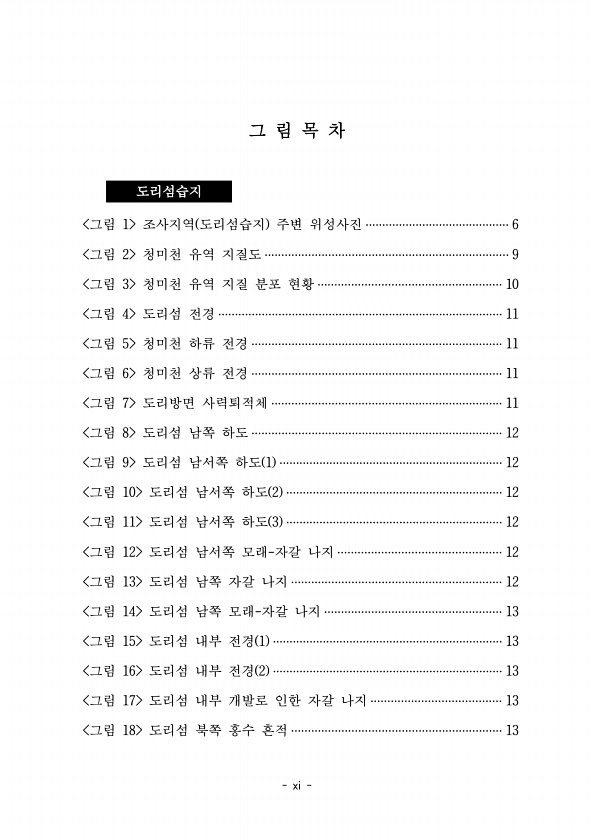 30 그 림 목 차 도리섬습지 1 그림 조사지역 도리섬습지 주변 위성사진 ··········································· 6 2 그림 청미천 유역 지질도 ········································································· 9 3 그림 청미천 유역 지질 분포 현황 ······················································· 10 4 그림 도리섬 전경 ····················································································· 11 5 그림 청미천 하류 전경 ·························...