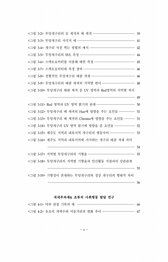 x 그림 3-2 무당개구리의 등 체색과 배 체색 ······················································ 39 그림 3-3 무당개구리 서식지 예 ·········································································· 41 그림 3-4 개구리 사진 찍는 방법의 예시 ·························································· 42 그림 3-5 무당개구리의 SVL 측정 ······································································ 44 그림 3-6 스펙트로미터를 이용해 배면 측정 ············...