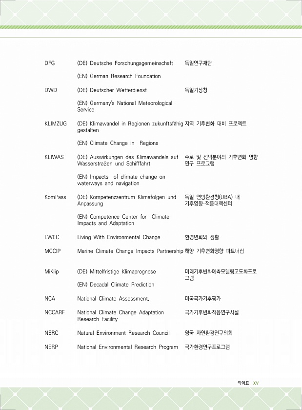 약어표 xv DFG DE Deutsche Forschungsgemeinschaft EN German Research Foundation 독일연구재단 DWD DE Deutscher Wetterdienst EN Germanys National Meteorological Service 독일기상청 KLIMZUG DE Klimawandel in Regionen zukunftsf?hig gestalten EN Climate Change in Regions 지역 기후변화 대비 프로젝트 KLIWAS DE Auswirkungen des Klimawandels auf Wasserstraßen und Schifffahrt EN Impacts of climate change on waterways and navigation 수로...