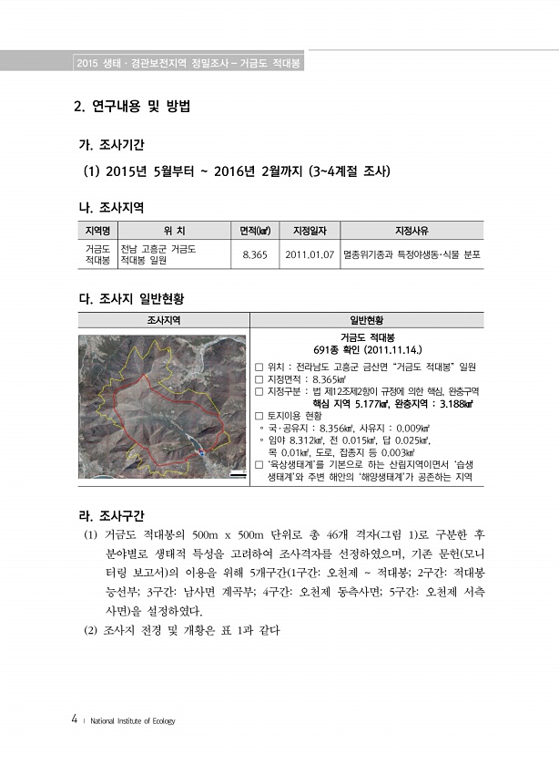 2015 생태·경관보전지역 정밀조사 거금도 적대봉 4 ? National Institute of Ecology 2. 연구내용 및 방법 가. 조사기간 1 2015년 5월부터 2016년 2월까지 34계절 조사 나. 조사지역 지역명 위 치 면적 ㎢ 지정일자 지정사유 거금도 적대봉 전남 고흥군 거금도 적대봉 일원 8.365 2011.01.07 멸종위기종과 특정야생동·식물 분포 다. 조사지 일반현황 조사지역 일반현황 거금도 적대봉 691종 확인 2011.11.14. □ 위치 전라남도 고흥군 금산면 “거금도 적대봉” 일원 □ 지정면적 8.365㎢ □ 지정구분 법 제12조제2항이 규정에 의한 핵심, 완충구역 핵심 지역 5.177㎢, 완충지역 3.188㎢ □ 토지이용 현황 ? 국 ? 공유지 8.356㎢, 사유지 0.009...