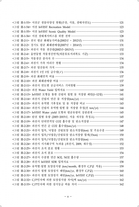 x 그림 Ⅲ-1-53 서천군 생물다양성 현황 곤충, 식물, 생태자연도 ·········································121 그림 Ⅲ-1-54 서천 InVEST Recreation Model ········································································123 그림 Ⅲ-1-55 서천 InVEST Scenic Quality Model ································································123 그림 Ⅲ-1-56 서천 생태계서비스를 위한 전략 ···································································...
