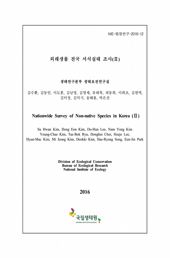 NIE-법정연구-2016-12 외래생물 전국 서식실태 조사 Ⅱ 생태연구본부 생태보전연구실 김수환, 김동언, 이도훈, 김남영, 김영채, 류태복, 최동희, 이희조, 김현맥, 김미정, 김덕기, 송해룡, 박은진 Nationwide Survey of Non-native Species in Korea Ⅱ Su Hwan Kim, Dong Eon Kim, Do-Hun Lee, Nam Yong Kim Young-Chae Kim, Tae-Bok Ryu, Donghui Choi, Heejo Lee, Hyun-Mac Kim, Mi Jeong Kim, Deokki Kim, Hae-Ryong Song, Eun-Jin Park Division of Ecological Conservation Bureau of Ecological Res...