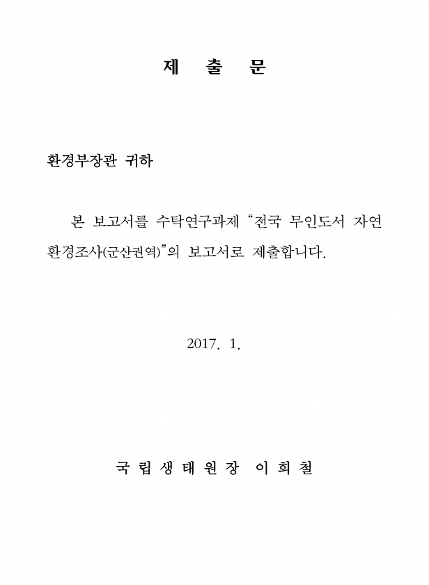 제 출 문 환경부장관 귀하 본 보고서를 수탁연구과제 “전국 무인도서 자연 환경조사 군산권역 ”의 보고서로 제출합니다. 2017. 1. 국 립 생 태 원 장 이 희철
