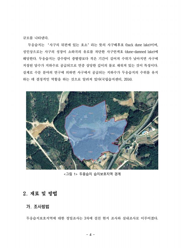 4 규모를 나타낸다. 두웅습지는 ‘사구의 뒤편에 있는 호소’라는 뜻의 사구배후호 back dune lake 이며, 성인상으로는 사구의 성장이 소하곡의 유로를 차단한 사구언색호 dune-damned lake 에 해당한다. 두웅습지는 강수량이 증발량보다 적은 기간이 길어져 수위가 낮아지면 사구에 저장된 담수가 지하수로 공급되므로 연중 상당한 깊이의 물로 채워져 있는 것이 특징이다. 실제로 수문 분야의 연구에 의하면 사구에서 공급되는 지하수가 두웅습지의 수위를 유지 하는 데 결정적인 역할을 하는 것으로 알려져 있다 국립습지센터, 2014 그림 1 두웅습지 습지보호지역 경계 2. 재료 및 방법 가. 조사방법 두웅습지보호지역에 대한 정밀조사는 3차에 걸친 현지 조사와 실내조사로이루어졌다.