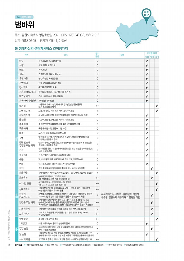 No. 속초- 본 생태자산의 생태계서비스 간이평가지 구분 예시 평가 등급 설명 규모별 혜택 지점 지역 국가 공급 담수 식수, 농업용수, 축산 용수 등 0 √ 식량 곡물, 과실, 물고기 등 0 √ 연료 화목, 토탄 0 √ 섬유 건축용 목재, 의류용 섬유 등 0 √ 유전자원 농업·축산업 희귀품종 등 0 √ 천연약재 전통 의약품에 사용되는 식물 0 √ 장식재료 수집용 조개껍질, 꽃 등 0 √ 진흙,미네랄, 골재 건축용 모래 또는 자갈, 벽돌재료 진흙 등 0 √ 폐기물처리 고체 쓰레기 하치, 폐수 방류 등 0 √ 친환경에너지발전 조력발전, 풍력발전 0 √ 조절 대기질 자동차 배기가스, 산업체 대기오염, 농업발생 먼지 등의 대기 미세물질의 제거 ++ √ 지역적 기후 그늘, 대기온도 저하 등의 지역 미세기후 조절 + ...