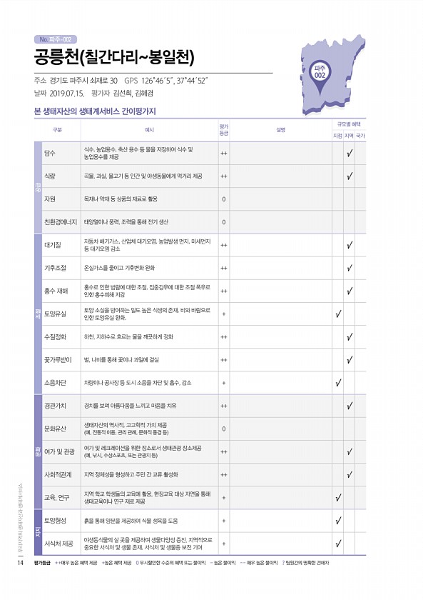 No. 파주- 파주 002 본 생태자산의 생태계서비스 간이평가지 구분 예시 평가 등급 설명 규모별 혜택 지점 지역 국가 공급 담수 식수, 농업용수, 축산 용수 등 물을 저장하여 식수 및 농업용수를 제공 ++ √ 식량 곡물, 과실, 물고기 등 인간 및 야생동물에게 먹거리 제공 ++ √ 자원 목재나 약재 등 상품의 재료로 활용 0 친환경에너지 태양열이나 풍력, 조력을 통해 전기 생산 0 조절 대기질 자동차 배기가스, 산업체 대기오염, 농업발생 먼지, 미세먼지 등 대기오염 감소 ++ √ 기후조절 온실가스를 줄이고 기후변화 완화 ++ √ 홍수 재해 홍수로 인한 범람에 대한 조절, 집중강우에 대한 조절 폭우로 인한 홍수피해 저감 ++ √ 토양유실 토양 소실을 방어하는 밀도 높은 식생의 존재, 비와 바람으로 인한 토양...