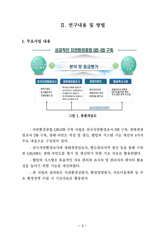 4 Ⅱ. 연구내용 및 방법 1. 주요사업 내용 그림 1. 총괄개념도 자연환경종합 GIS-DB 구축 사업은 전국자연환경조사 DB 구축, 생태계정 밀조사 DB 구축, 생태·자연도 작성 및 갱신, 웹입력 시스템 기능 개선의 4가지 주요 내용으로 구성되어 있다. 전국자연환경조사와 생태계정밀조사, 별도관리지역 갱신 등을 통해 구축 된 GIS-DB는 생태·자연도를 평가 및 갱신하기 위한 기초 자료로 활용하였다. 웹입력 시스템은 효율적인 자료 관리와 조사자 및 관리자의 데이터 활용 성을 높이기 위한 기능을 개선하였다. 본 사업의 결과물은 사전환경성평가, 환경영향평가, 국토이용계획 등 주 요 환경정책 수립 시 기초자료로활용된다.