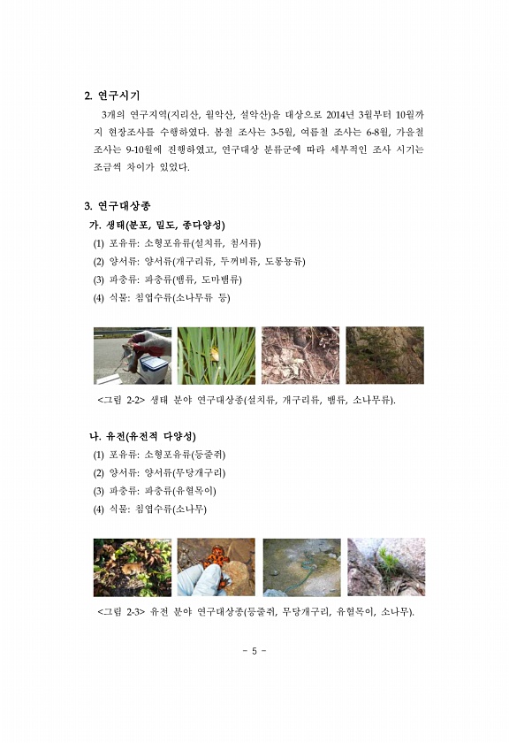 5 2. 연구시기 3개의 연구지역 지리산, 월악산, 설악산 을 대상으로 2014년 3월부터 10월까 지 현장조사를 수행하였다. 봄철 조사는 3-5월, 여름철 조사는 6-8월, 가을철 조사는 9-10월에 진행하였고, 연구대상 분류군에 따라 세부적인 조사 시기는 조금씩 차이가 있었다. 3. 연구대상종 가. 생태 분포, 밀도, 종다양성 1 포유류소형포유류 설치류, 첨서류 2 양서류양서류 개구리류, 두꺼비류, 도롱뇽류 3 파충류파충류 뱀류, 도마뱀류 4 식물침엽수류 소나무류 등 그림 2-2 생태 분야 연구대상종 설치류, 개구리류, 뱀류, 소나무류 나. 유전 유전적 다양성 1 포유류소형포유류 등줄쥐 2 양서류양서류 무당개구리 3 파충류파충류 유혈목이 4 식물침엽수류 소나무 그림 2-3 유전 분야 연구대상종 등줄쥐, ...