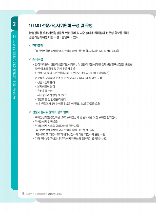 16 _ 환경부 유전자변형생물체 안전관리 가이드 1 2 L M O 전문가심사위원회 구성 및 운영 환경정화용 유전자변형생물체 안전관리 및 자연생태계 위해성의 전문성 확보를 위해 전문가심사위원회를 구성·운영하고 있다. ○ 관련규정 「유전자변형생물체의 국가간 이동 등에 관한 통합고시」 제6-6조 및 제6-7조4항 ○ 조직구성 환경부장관이 위원장 생물다양성과장 , 부위원장 국립생태원 생태보전연구실장 을 포함한 30인 이내의 학계 및 관계 전문가 위촉 ※ 현재 5개 분과 22인 위촉 교수 11, 연구기관 9, 시민단체 1, 환경부 1 전문성을 고려하여 위촉된 위원 중 4인 이내의 5개 분야로 구성 · 생물·생태 분야 · 분자생물학 분야 · 유전육종 분야 · 자연생태계 영향평가 분야 · 환경방출 및 안전관리 분야 ※ ...