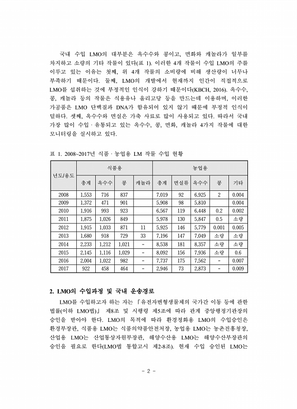 2 국내 수입 LMO의 대부분은 옥수수와 콩이고, 면화와 캐놀라가 일부를 차지하고 소량의 기타 작물이 있다 표 1 이러한 4개 작물이 수입 LMO의 주를 이루고 있는 이유는 첫째, 위 4개 작물의 소비량에 비해 생산량이 너무나 부족하기 때문이다. 둘째, LMO의 개발에서 현재까지 인간이 직접적으로 LMO를 섭취하는 것에 부정적인 인식이 강하기 때문이다 KBCH, 2016 옥수수, 콩, 캐놀라 등의 작물은 식용유나 올리고당 등을 만드는데 이용하며, 이러한 가공품은 LMO 단백질과 DNA가 함유되어 있지 않기 때문에 부정적 인식이 덜하다. 셋째, 옥수수와 면실은 가축 사료로 많이 사용되고 있다. 따라서 국내 가장 많이 수입ㆍ유통되고 있는 옥수수, 콩, 면화, 캐놀라 4가지 작물에 대한 모니터링을 실시하고 있다....