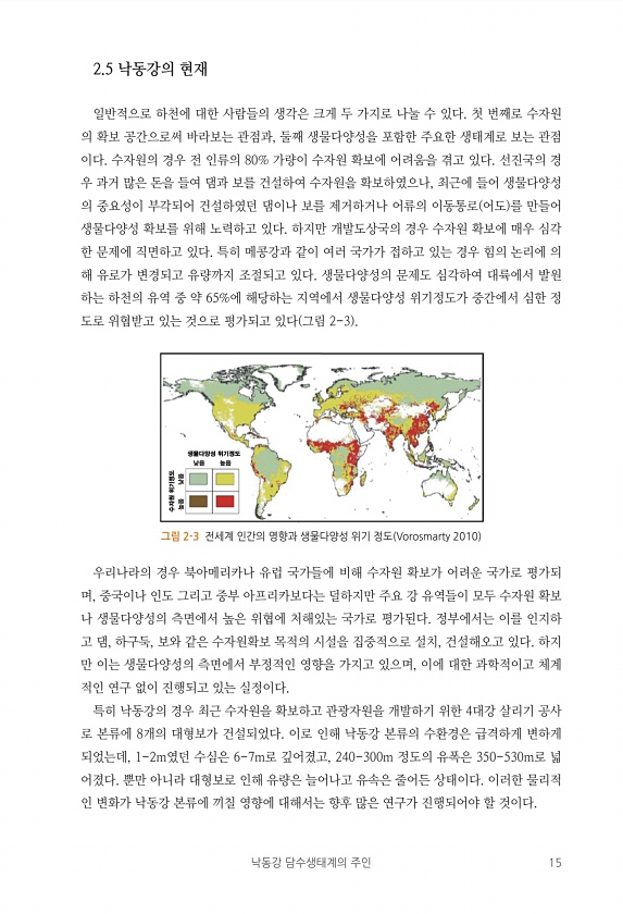 낙동강 담수생태계의 주인 15 2.5 낙동강의 현재 일반적으로 하천에 대한 사람들의 생각은 크게 두 가지로 나눌 수 있다. 첫 번째로 수자원 의 확보 공간으로써 바라보는 관점과, 둘째 생물다양성을 포함한 주요한 생태계로 보는 관점 이다. 수자원의 경우 전 인류의 80% 가량이 수자원 확보에 어려움을 겪고 있다. 선진국의 경 우 과거 많은 돈을 들여 댐과 보를 건설하여 수자원을 확보하였으나, 최근에 들어 생물다양성 의 중요성이 부각되어 건설하였던 댐이나 보를 제거하거나 어류의 이동통로 어도 를 만들어 생물다양성 확보를 위해 노력하고 있다. 하지만 개발도상국의 경우 수자원 확보에 매우 심각 한 문제에 직면하고 있다. 특히 메콩강과 같이 여러 국가가 접하고 있는 경우 힘의 논리에 의 해 유로가 변경되고 유량까지 ...