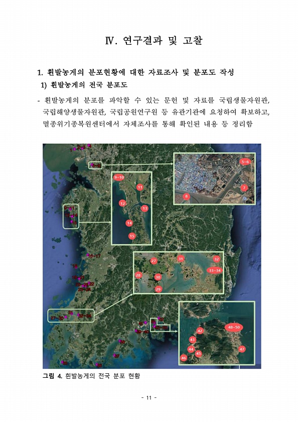 11 Ⅳ. 연구결과 및 고찰 1. 흰발농게의 분포현황에 대한 자료조사 및 분포도 작성 1 흰발농게의 전국 분포도 흰발농게의 분포를 파악할 수 있는 문헌 및 자료를 국립생물자원관, 국립해양생물자원관, 국립공원연구원 등 유관기관에 요청하여 확보하고, 멸종위기종복원센터에서 자체조사를 통해 확인된 내용 등 정리함 그림 4. 흰발농게의 전국 분포현황