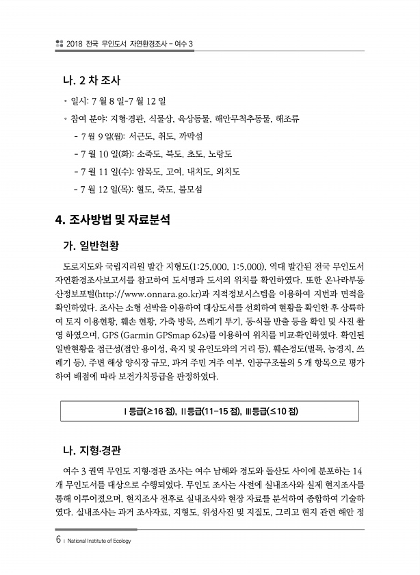 2018 전국 무인도서 자연환경조사 여수 3 6 ? National Institute of Ecology 2 ? 일시7 월 8 일-7 월 12 일 ? 참여 분야지형?경관, 식물상, 육상동물, 해안무척추동물, 해조류 7 월 9 일 월 서근도, 취도, 까막섬 7 월 10 일 화 소죽도, 북도, 초도, 노랑도 7 월 11 일 수 암목도, 고여, 내치도, 외치도 7 월 12 일 목 혈도, 죽도, 불모섬 4. 도로지도와 국립지리원 발간 지형도 125,000, 15,000 , 역대 발간된 전국 무인도서 자연환경조사보고서를 참고하여 도서명과 도서의 위치를 확인하였다. 또한 온나라부동 산정보포털 http//www.onnara.go.kr 과 지적정보시스템을 이용하여 지번과 면적을 확인하였다. 조사는 소형 선박을 이용하여 대...