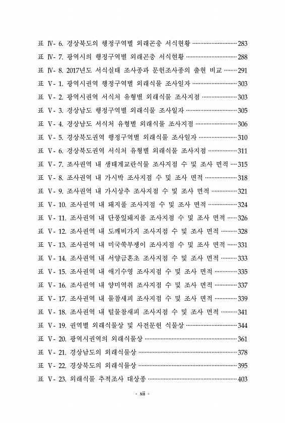 xii 표 Ⅳ- 6. 경상북도의 행정구역별 외래곤충 서식현황 ····························283 표 Ⅳ- 7. 광역시의 행정구역별 외래곤충 서식현황 ································288 표 Ⅳ- 8. 2017년도 서식실태 조사종과 문헌조사종의 출현 비교 ········291 표 Ⅴ- 1. 광역시권역 행정구역별 외래식물 조사일자 ····························303 표 Ⅴ- 2. 광역시권역 서식처 유형별 외래식물 조사지점 ······················303 표 Ⅴ- 3. 경상남도 행정구역별 외래식물 조사일자 ································305 표 Ⅴ- 4. 경상남도 서식처 유형별 외래식물 조사지점 ···...