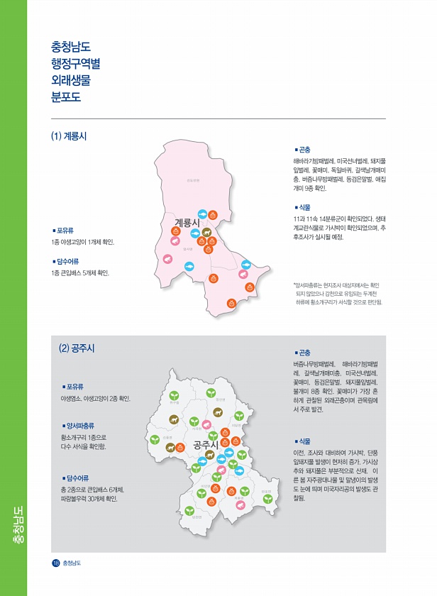 충청남도 18 충청남도 1 계룡시 *양서파충류는 현지조사 대상지에서는 확인 되지 않았으나 갑천으로 유입되는 두계천 하류에 황소개구리가 서식할 것으로 판단됨. 2 공주시 ?담수어류 총 2종으로 큰입배스 6개체, 파랑볼우럭 30개체 확인. ?양서파충류 황소개구리 1종으로 다수 서식을 확인함. ?포유류 야생염소, 야생고양이 2종 확인. ?곤충 해바라기방패벌레, 미국선녀벌레, 돼지풀 잎벌레, 꽃매미, 독일바퀴, 갈색날개매미 충, 버즘나무방패벌레, 등검은말벌, 애집 개미 9종 확인. ?식물 11과 11속 14분류군이 확인되었다. 생태 계교란식물로 가시박이 확인되었으며, 추 후조사가 실시될 예정. ?포유류 1종 야생고양이 1개체 확인. ?담수어류 1종 큰입배스 5개체 확인. ?곤충 버즘나무방패벌레, 해바라기방패벌 레,...