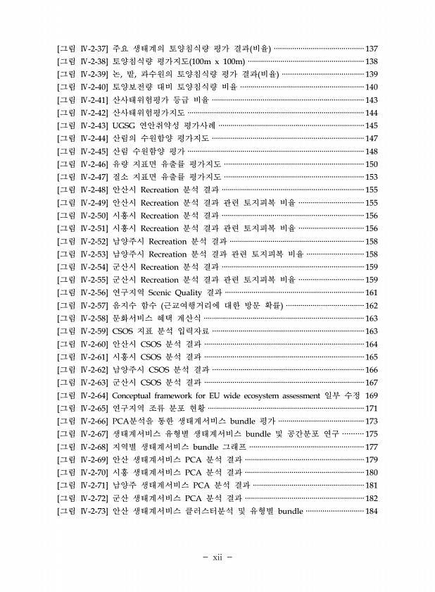 [그림 Ⅳ-2-37] 주요 생태계의 토양침식량 평가 결과 비율 ············································137 [그림 Ⅳ-2-38] 토양침식량 평가지도 100m x 100m ·························································138 [그림 Ⅳ-2-39] 논, 밭, 과수원의 토양침식량 평가 결과 비율 ········································139 [그림 Ⅳ-2-40] 토양보전량 대비 토양침식량 비율 ·····························································140 [그림 Ⅳ-2-41] 산사태위험평가 등급 비율 ··················...