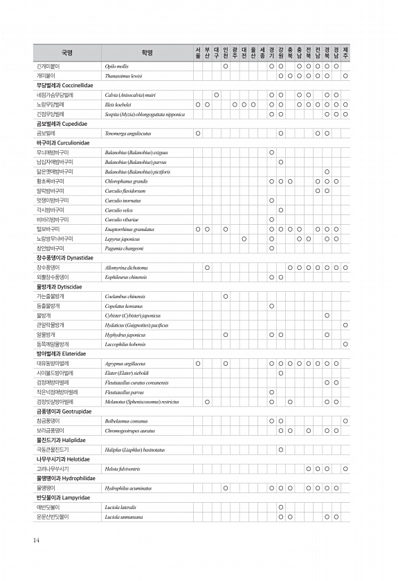 14 긴개미붙이 Opilo mollis ○ ○ ○ ○ ○ ○ ○ ○ 개미붙이 Thanassimus lewisi ○ ○ ○ ○ ○ ○ ○ 무당벌레과 Coccinellidae 네점가슴무당벌레 Calvia Anisocalvia muiri ○ ○ ○ ○ ○ ○ ○ 노랑무당벌레 Illeis koebelei ○ ○ ○ ○ ○ ○ ○ ○ ○ ○ ○ ○ ○ 긴점무당벌레 Sospita Myzia oblongoguttata nipponica ○ ○ ○ ○ ○ 곰보벌레과 Cupedidae 곰보벌레 Tenomerga anguliscutus ○ ○ ○ ○ 바구미과 Curculionidae 무늬애밤바구미 Balanobius Balanobius exiguus ○ 남십자애밤바구미 Balanobius Balanobius parvus ○ ...