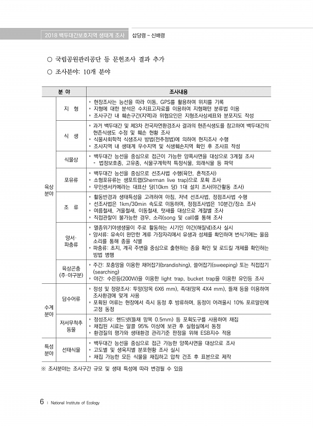 2018 백두대간보호지역 생태계 조사 삽당령 신배령 6 ? National Institute of Ecology ○ 국립공원관리공단 등 문헌조사 결과 추가 ○ 조사분야10개 분야 분 야 조사내용 육상 분야 지 형 ? 현장조사는 능선을 따라 이동, GPS를 활용하여 위치를 기록 ? 지형에 대한 분석은 수치표고자료를 이용하여 지형패턴 분류법 이용 ? 조사구간 내 훼손구간 지역 과 위협요인은 지형조사상세표와 분포지도 작성 식 생 ? 과거 백두대간 및 제3차 전국자연환경조사 결과의 현존식생도를 참고하여 백두대간의 현존식생도 수정 및 훼손 현황 조사 ? 식물사회학적 식생조사 방법 전추정법 에 의하여 현지조사 수행 ? 조사지역 내 생태계 우수지역 및 식생훼손지역 확인 후 조사표 작성 식물상 ? 백두대간 능선을 중심으로...