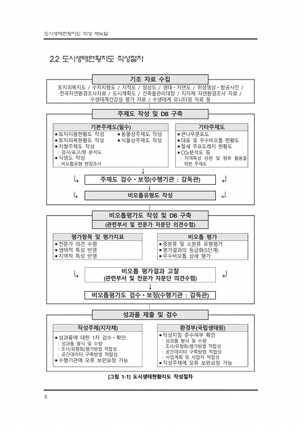 도시생태현황지도 작성 매뉴얼 6 2.2 도시생태현황지도 작성절차 기초 자료 수집 토지피복지도 수치지형도 지적도 임상도 생태ㆍ자연도 위성영상ㆍ항공사진 전국자연환경조사자료 도시계획도 건축물관리대장 지자체 자연환경조사 자료 수생태계건강성 평가 자료 수생태계 모니터링 자료 등 주제도 작성 및 DB 구축 기본주제도 필수 기타주제도 ?토지이용현황도 작성 ?토지피복현황도 작성 ?지형주제도 작성 경사/표고/향 분석도 ?식생도 작성 비오톱유형 현장조사 ?동물상주제도 작성 ?식물상주제도 작성 ?큰나무분포도 ?대표 및 우수비오톱 현황도 ?철새 주요도래지 현황도 ?CO₂분석도 등 지역특성 관련 및 향후 활용을 위한 주제도 ↓ ? 주제도 검수ㆍ보정 수행기관 감독관 ? ↓ ? 비오톱유형도 작성 ? 비오톱평가도 작성 및 DB 구축 관...