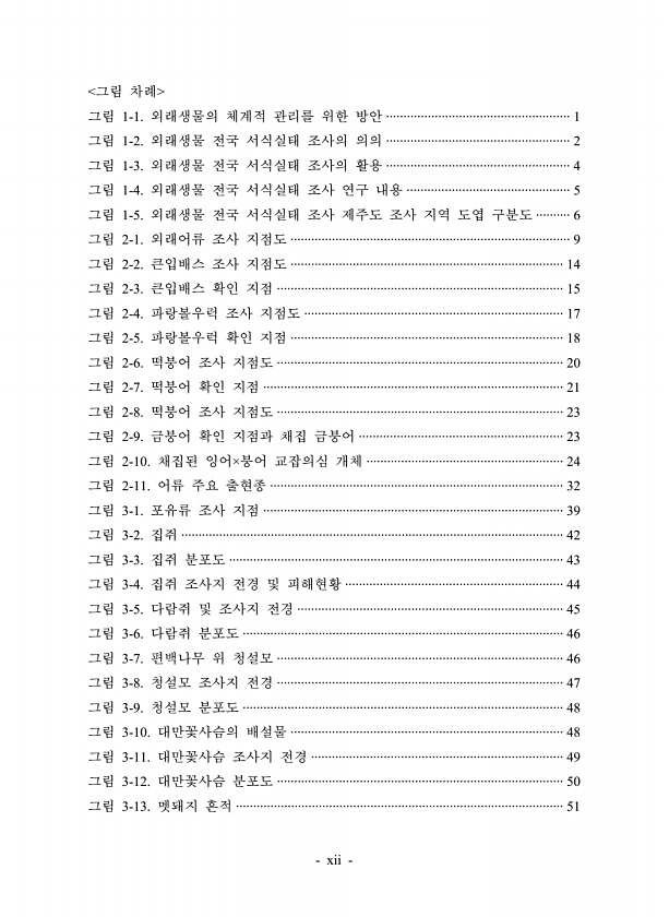 xii 그림 차례 그림 1-1. 외래생물의 체계적 관리를 위한 방안 ····················································· 1 그림 1-2. 외래생물 전국 서식실태 조사의 의의 ····················································· 2 그림 1-3. 외래생물 전국 서식실태 조사의 활용 ····················································· 4 그림 1-4. 외래생물 전국 서식실태 조사 연구 내용 ··············································· 5 그림 1-5. 외래생물 전국 서식실태 조사 제주도 조사 지역 도엽 구분도 ·········· 6 그림 2...