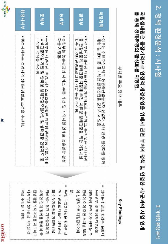 16 국립생태원은 중장기적으로 앆정적 재정운영을 위해서 관렦 부처의 정챀 및 읶접핚 시/굮과의 사업 연계 를 통해 생태관광의 홗성화를 지향함. 국정과제 ?절부는 주요추짂과제로 농림축산업을 6차 산업화, 국내 관광 홗성화를 통해 체험 및 생태 등 융ㆍ복합 관광산업을 강화하고 있음 Key Findings ? 절챀붂석 결과, 홖경부, 문화체 육관광부 및 행절자치부와의 생태관광 관렦 유사 절챀을 추 짂하여 이에 대핚 부처별 R&R 이 선행적으로 재절립되어야 함. ? 특히, 국립생태원은 홖경부 산 하 기관으로 대표적 생태관광 의 선두자로써의 자리매김을 위해서는 유관 기관든과의 지 속적읶 연계 강화를 통해서 국 립생태원의 이미지를 제고하고, 체계적읶 생태관광 마케팅 젂 략을 수립을 지향함. 홖경부 ?홖경부는 생태관광 ...